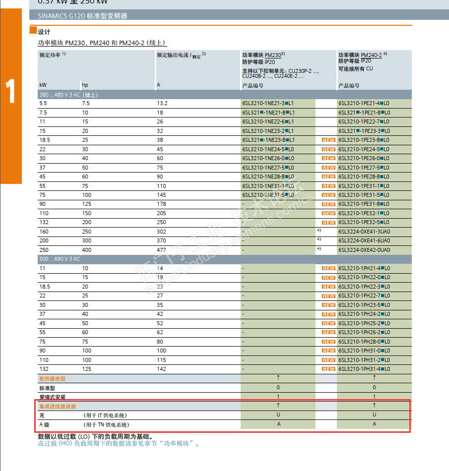 G120功率单元PM240-2系列,手册上显示PM240-2分为内置滤波器和不带内置滤波器两个型号。