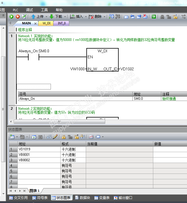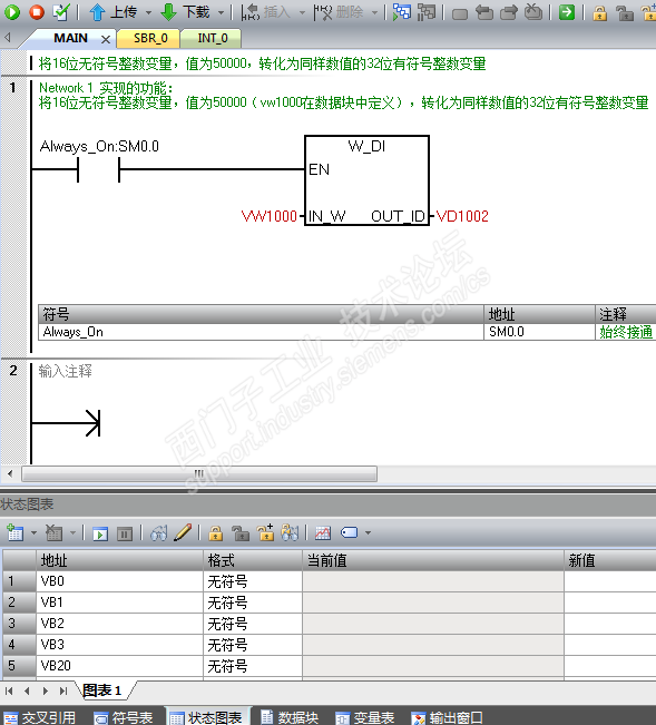 今天练习转换指令,有“将16位无符号整数变量,值为50000,转化为同样数值的32位有符号整数变量”,我用I-DI命令虽然能成功,但是还是不明就里。于是打开老师给的答案如下图