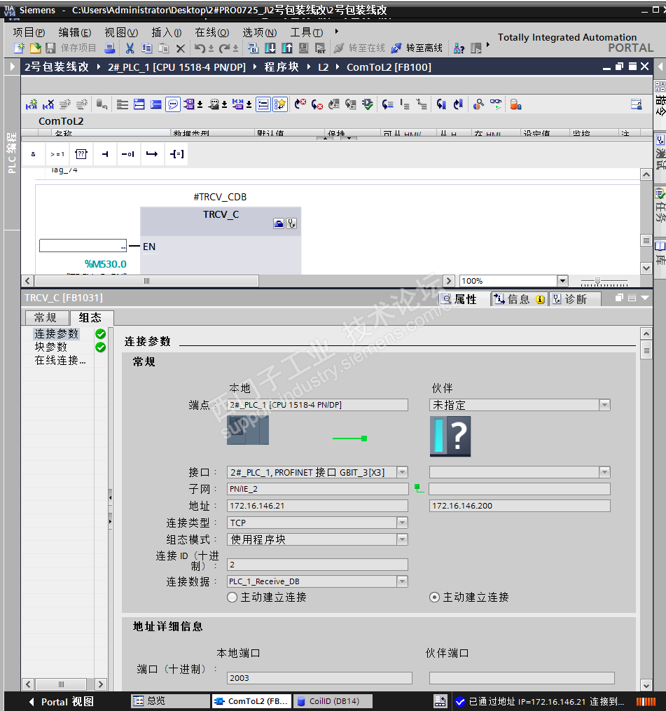 4、PLC与二级进行TCP开放式通讯,PLC里调用的指令:TSEND_C和TRCV_C;