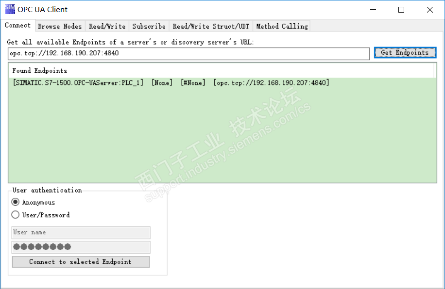 我是从西门子工业中心论坛下载的OPC UA相关压缩包,里面有C#的Demo程序、博途的程序以及说明文档,我按照说明文档进行环境搭建和测试,但最终发现,在Get Endpoints的时候,永远只能获取一个Endpoint,如下图所示: