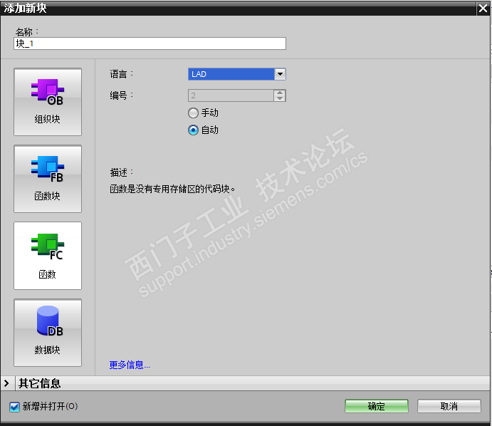 图3:自己编程,创建FC,语言可以选择LAD,SCL,FBD