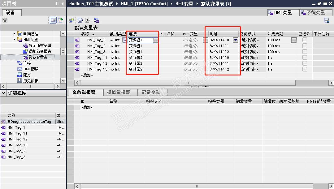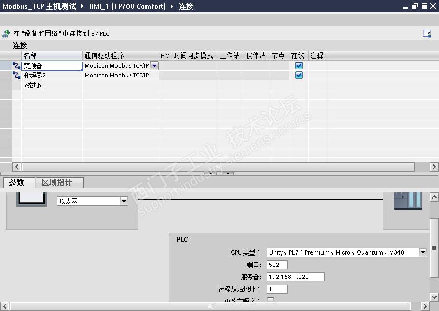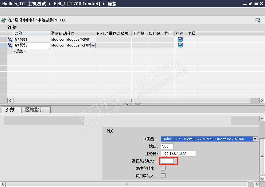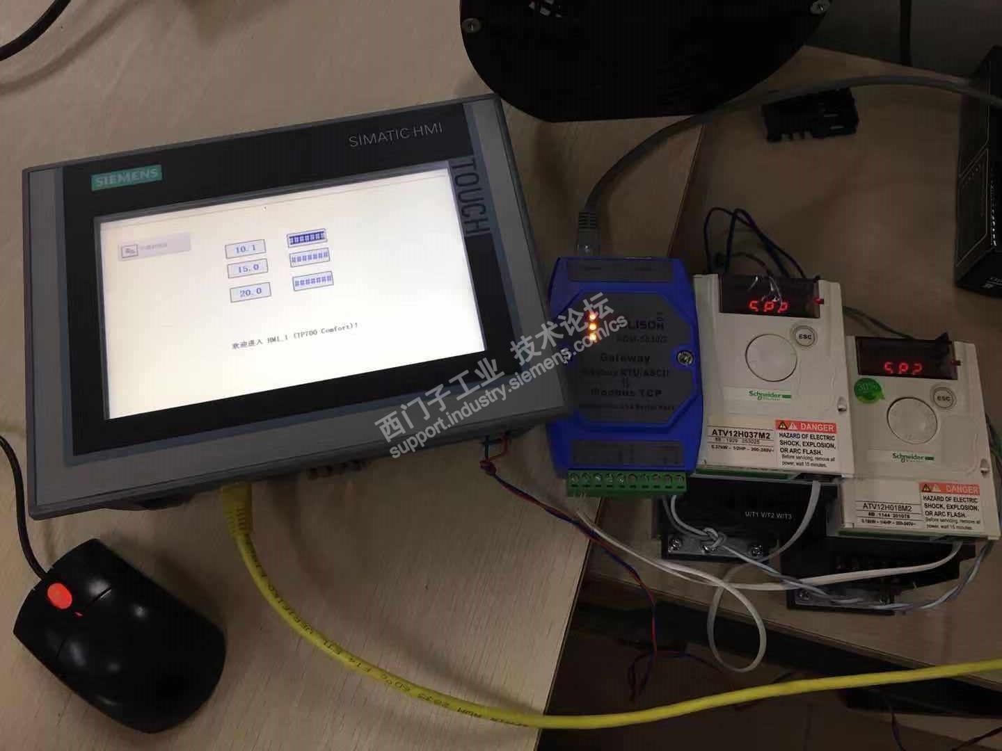 TP700 触摸屏通过MODBUS_TCP方式,经过一个MODBUS_TCP转换MODBUS_RTU -485 与两个施耐德变频器通信,现在的问题就是触摸屏只能与一其中一个变频器通信,不能同时连接到两个变频器,用同样的连接方法和连接设备,把TP700换成威纶或繁易的屏,都可以同时与两个变频器通信,这说明物理连接,变频器的设置都是OK,但用TP700就是通信不上。