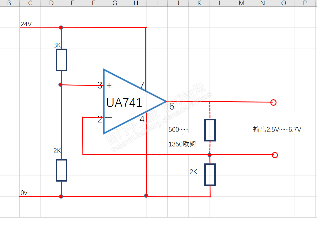 现场要求将电机温度读入PLC,当温度达到某值时加循环水强制冷却或报警。用运算放大器加电阻做了一个简易的阻值——电压转换电路: