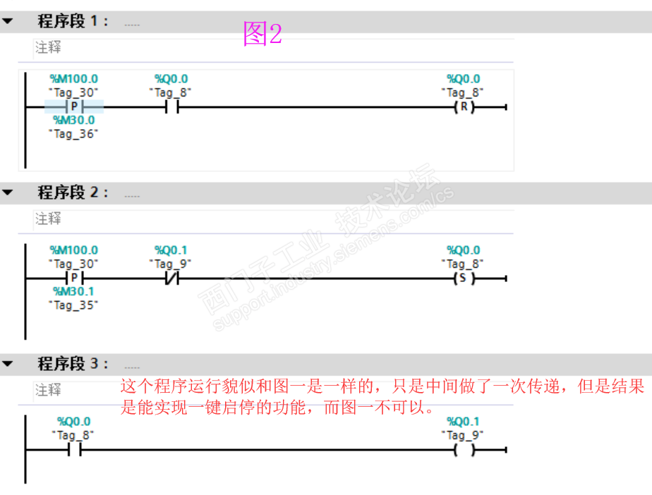 2:遇到的问题:之前用其他方法实现过一键启停。这次尝试用置位指令来实现,本来以为简单的事情,遇到困惑。程序贴图如下: