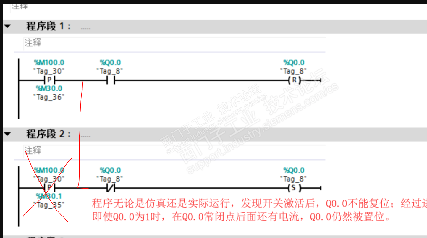 至于你的单键启停好像有点怪,你要知道一般的指令不是立即输出,而是在所有逻辑运算完,在输出映像区统一输出。你这样写,相当于在一个周期内按了两次,程序段2会被程序段1影响。