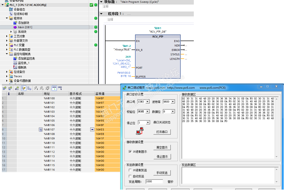 我用S7-1200与一个变送器进行485口的自由协议通信,S7-1200做接收端,只接收数据,波特率和数据格式设置都一致,485模块上灯也闪烁正常,但是通过博图读上来的数据却和串口助手读的数据不一致,串口助手的数据是对的,一条数据正常为02 30 31 31 40 48 20 20 35 36 36 34 36 31 0D 0A, 图中数据长度也修改大过了,没有效果,求助!!