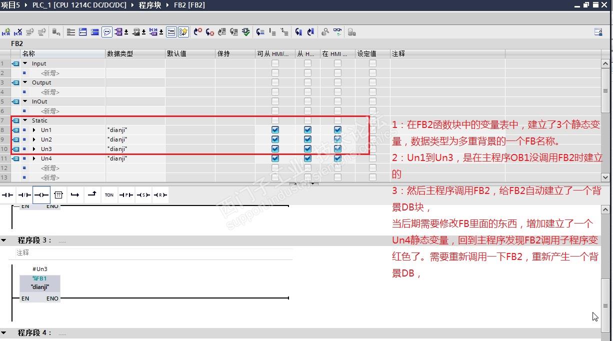 1:在FB2函数块中的变量表中,建立了3个静态变量,数据类型为多重背景的一个FB名称。