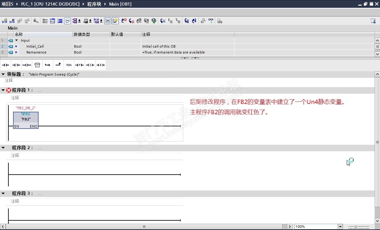 当后期需要修改FB里面的东西,增加建立了一个Un4静态变量,回到主程序发现FB2调用子程序变红色了。需要重新调用一下FB2,重新产生一个背景DB,