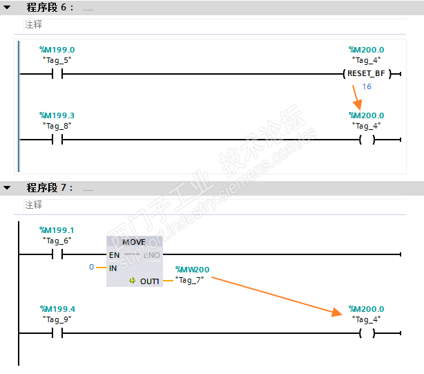 在程序段7中,我用Move指令发送数字0到MW200中,就是将从M200.0到M201.7清零了。这样,在图中第四行代码中,M199.4控制M200.0,M199.4闭合则M200.0的线圈得电从而吸合;M199.4断开则M200.0的线圈失电从而断开。这是没有问题的。
