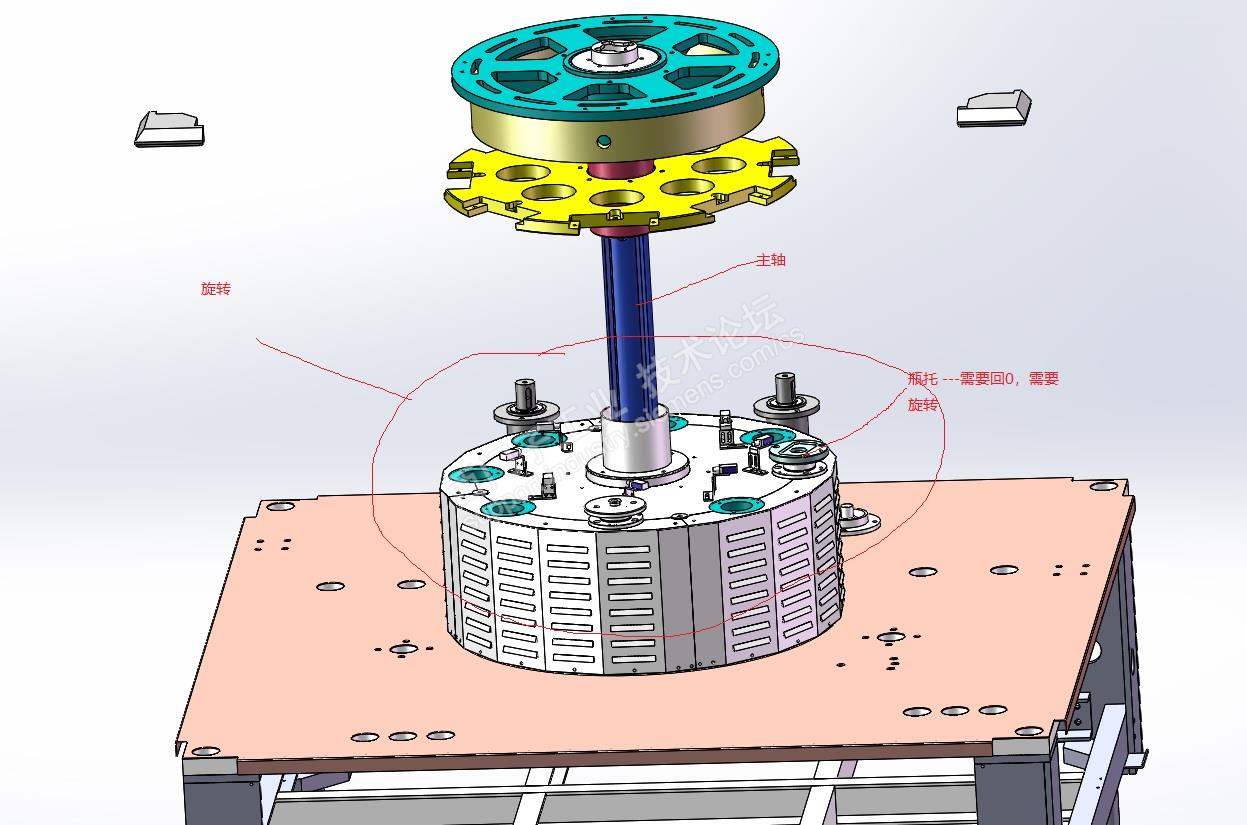 如图,为一旋转台,上面带8个工位瓶托,瓶托上面的瓶子自身也需要旋转;