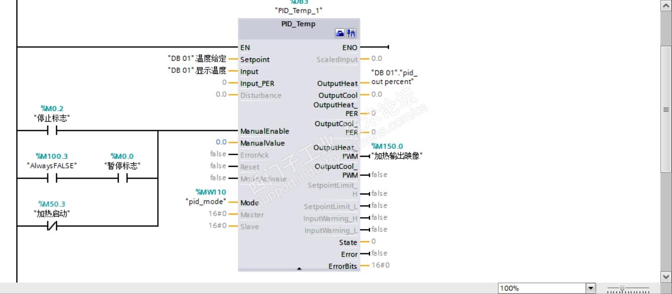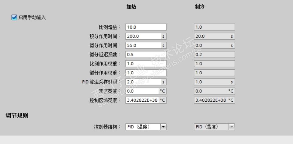设备是烘箱,采用s7-1200 1215c 通过pwm 控制固态继电器进行加热,在循环中断中调用pid temp 功能块实现,循环中断的间隔时间是100ms。设备按指定的温度曲线进行升温和保温,现在出现的问题如下:刚开始升温时,有时pid的输出会直接是100%,导致刚开始升温时短时间温度急剧升高(大部分情况下是正常的),后续可以自动控制,刚开始时的急剧升温如何解决,哪位大神有这方面的经验。相关的参数图片如下。