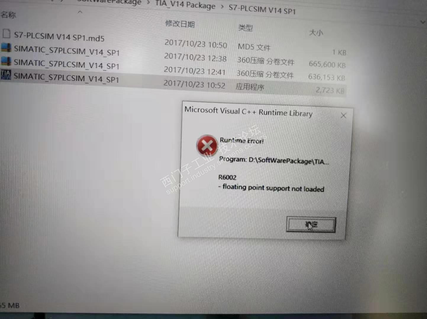 最近换了台电脑,win10专业版,安装STEP7 Pro V14SP1时顺利,到安装win cc Pro V14SP1时就报错R6002,在百度上搜索试了很多办法都没解决,搞了两天都是蒙蔽的,有无大神知道什么原因,帮帮忙!!