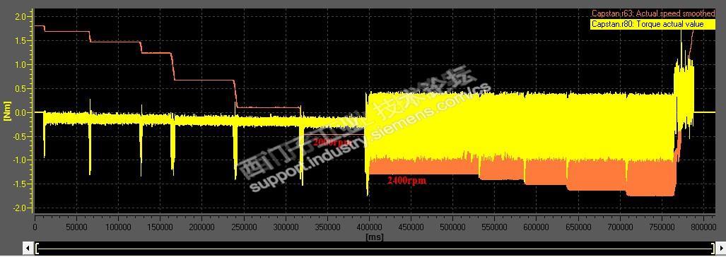 当转速低的时候,是没有扭矩变化这么奇怪的,当转速上升之后就出现了这个问题。因为主轮周长1m,因此当电机转速在2000m/min(2000rpm)及以上时,HMI反馈的速度实际值永远达不到设定值。同时电机扭矩极限报警r1407.7会出现。