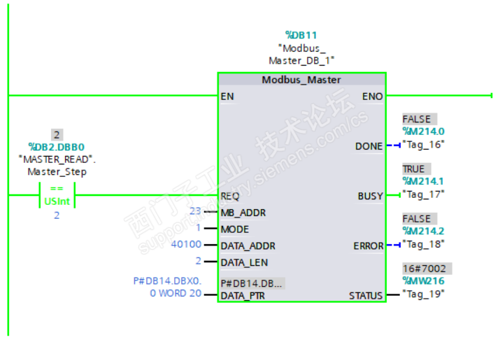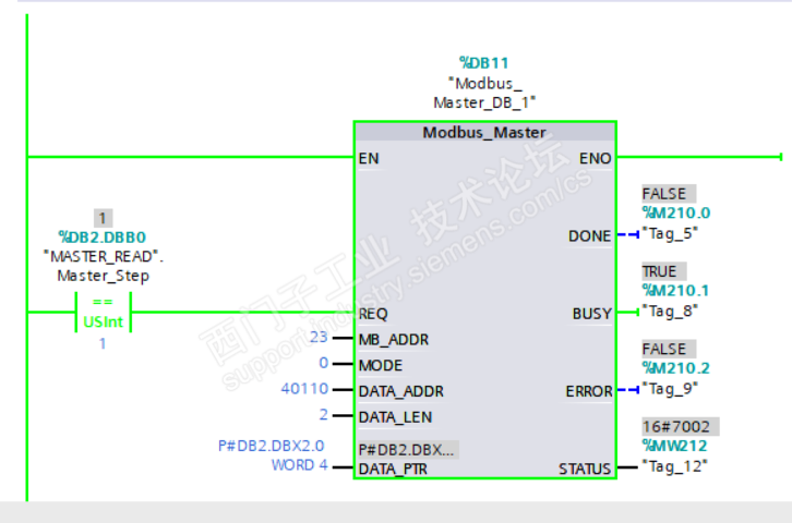 然后,通讯的时候发现,不管是单台变频还是多台变频,MODBUS_MASTER的BUSY一直都有置1。但DONE位也能够置1,STATUS位显示7000或7002。