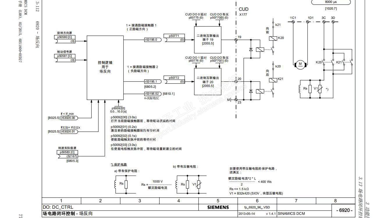 按功能6920场反向控制,只要P50580方向的源有改变,经过P50092的条件,就能控制P50771与P50772的输出。我16年第一次使用6RA80时,咨询过技术支持,他说这个功能在80装置上实现不了。我的控制系统是纯继电器控制,没有PLC,当时为了反向,直接在外部对励磁正反向交流接触器进行切换,但是这个切换有一个可怕的地方,当励磁未衰减时,接触触头就会挂掉。装置参数P50082=2,P50258=10时;现场操作人员未等到励磁降到0A时,就直接切换反向,控制柜内火光闪闪,总电源关都来不及,接触器还是烧了。后来就直接把P50258设定为0了,并指导现场操作工注意事项。80的装置上市到现在已经有几年时间了,不知道这个功能有没有实现?