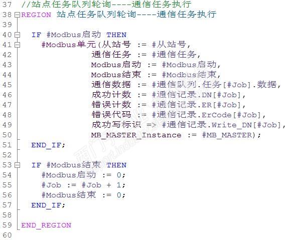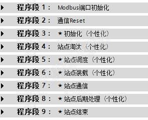 这个模块有两个FB:一个是站点FB;一个是Modbus任务执行FB,后者嵌入在前者内部做为子模块被调用执行。站点FB的功能是把任意从站的通信队列,在其内部调度分派给Modbus任务FB。任务FB每次执行一个任务,依次把整个队列执行完毕。同时顺便采集一些必要的监控信息。