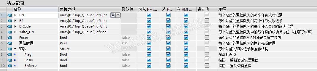 上述的站点通信模块的设计思路是比较清晰简单的,但是大家一定会看出,这种效果是与模块中用到的几个UDT的结构设计密切相关的。