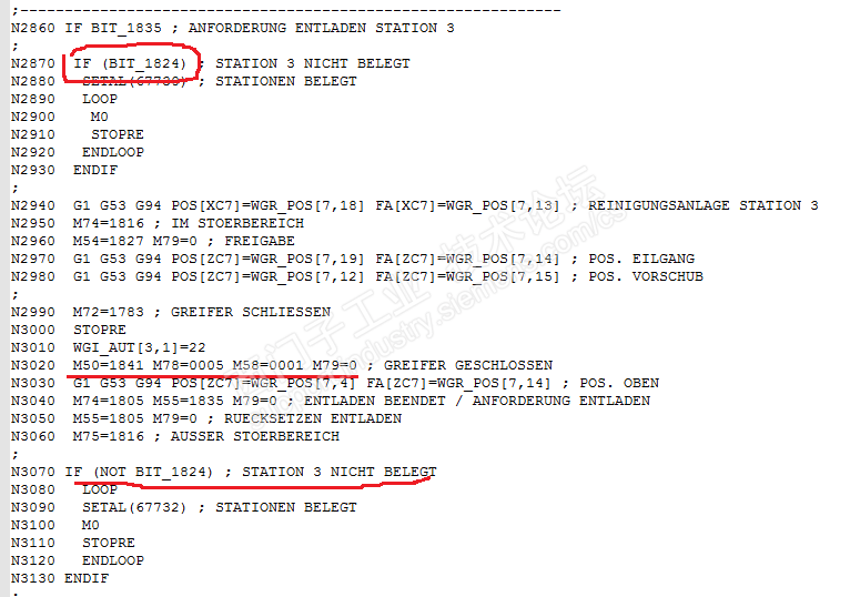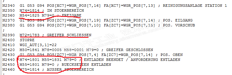 各位大神,单位某德国数控车床,系统为840Dsl,NC程序中使用大量的M扩展功能指令,如M74=1814,该如何理解啊,谢谢!下图为数控机床的部分桁架控制NC程序