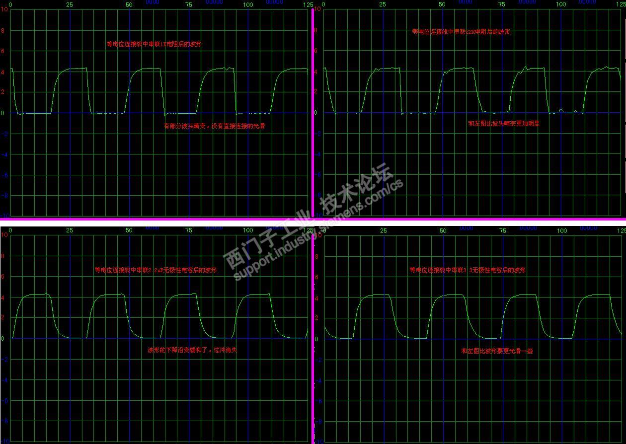模拟量输入的A+ A-和RS485的D+ D-有相似性,为了通讯的稳健,这个实验毫无疑问的告诉我们通讯的两个单元等电位连接是非常必要的。那为什么很多场合忽略了这个问题也能成功通讯,以至于给人错觉有无这个连接都无所谓。为此我接着用不同的阻容替代直接连接测量出下面图片中的波形,可以观察到有无连接的差别巨大,有连接之后1K和22K区别就不是很大了,这就是我们有时不连接也能成功的原因,那就是寄生的未被我们注意到的连接起到了这个等电位连接作用,比如电缆线芯间的漏电阻和寄生电容。