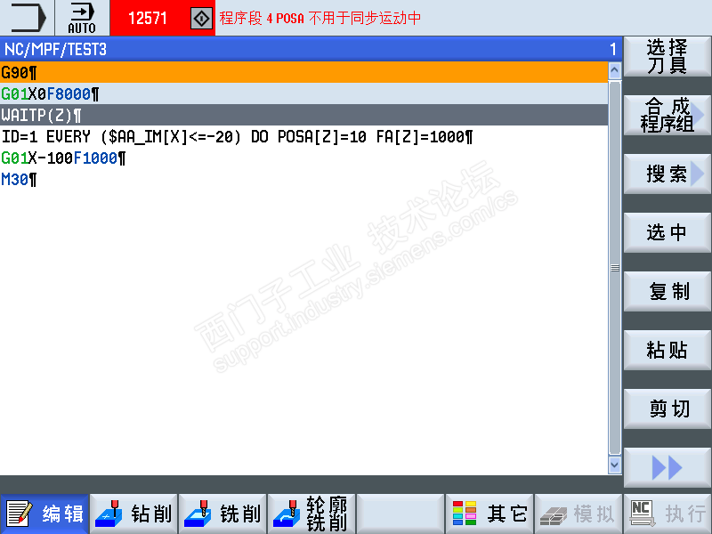 828d系统,同步动作程序里,不能使用POSA指令,见下图: