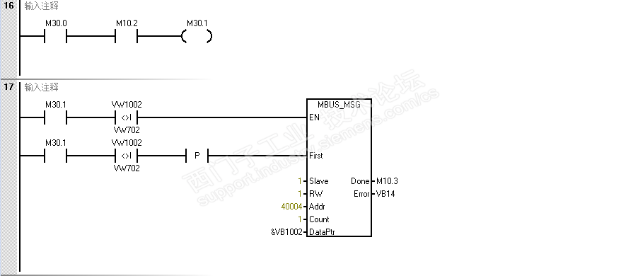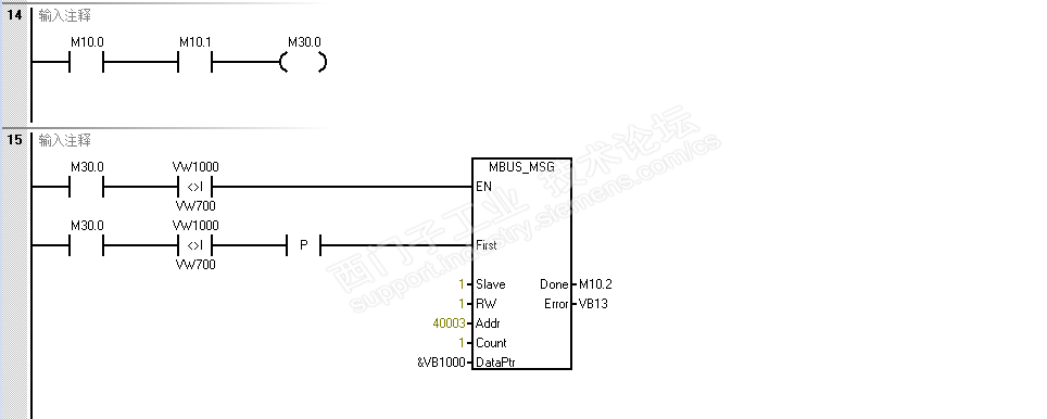 vw300-vw400存储上一次vw100-vw200的值,用来比较vw100-vw200数据是否发生变化,它们之间是一一对应的关系,比如说本次从仪表读过来的数据VW100发生变化(现场触摸屏更改),那么它和存储它上次数据的VW300必然不想等,然后我通过比较指令判断到这个条件之后,就将vw300,vw500,vw700都刷新成最新的vw100的值。