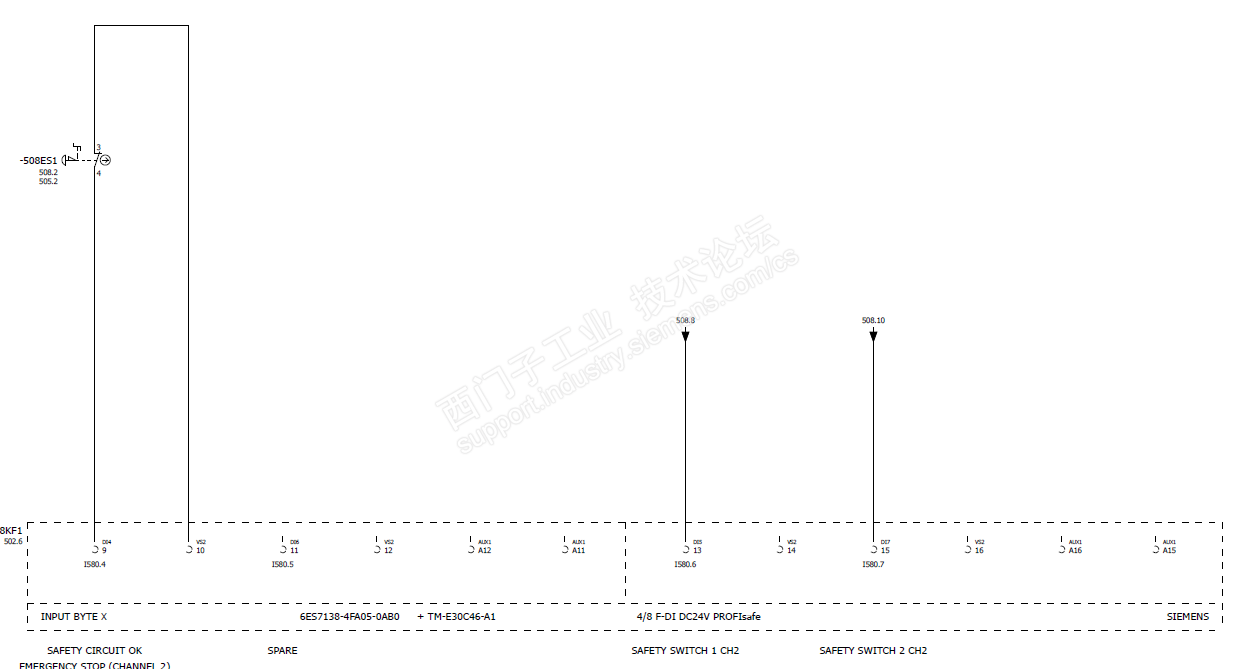 看到没有,这个电路图里I580.1确实没有接,难道电工的接线有问题,我们工程师没有纠正它们,将就着用了?然后我查看了接线端子没有问题,确实是按照图纸接的。但是为什么I580.1会有输入呢?很奇怪吧。