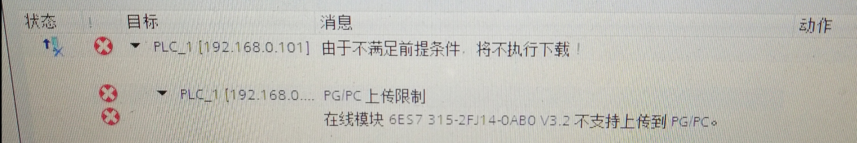 CPU,315F-2 PN/DP使用博途组态编程,原项目文件是v13sp1的。现在在现场使用博途v13sp1新建一个空项目(就是新建一个项目,里面软硬件都没有。),使用在线菜单的“将设备作为新站上传(硬件和软件)”,可以找到在线设备,但是上传时提示在线模块不支持上传到PG/PC。请问有朋友知道为什么吗?