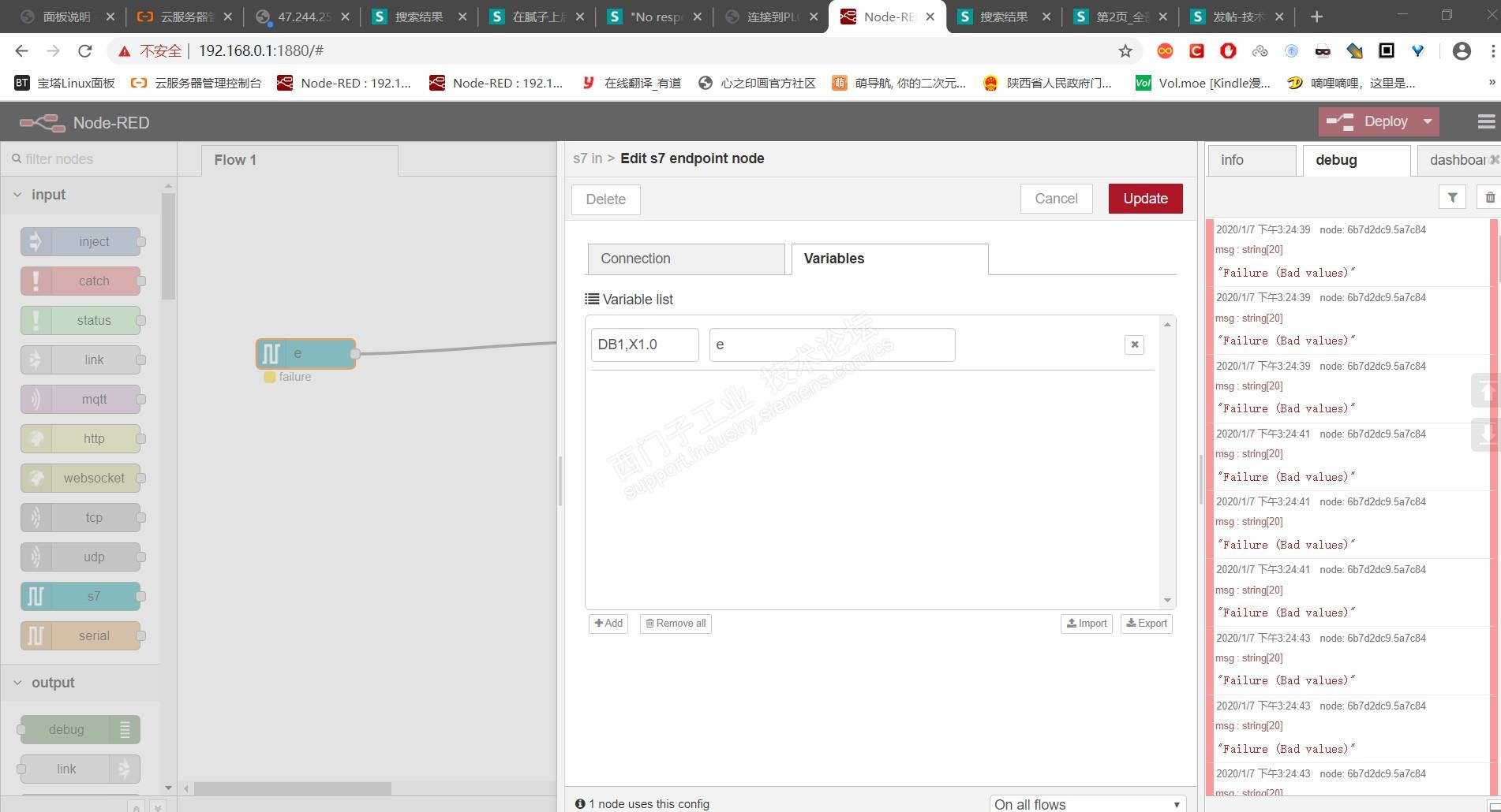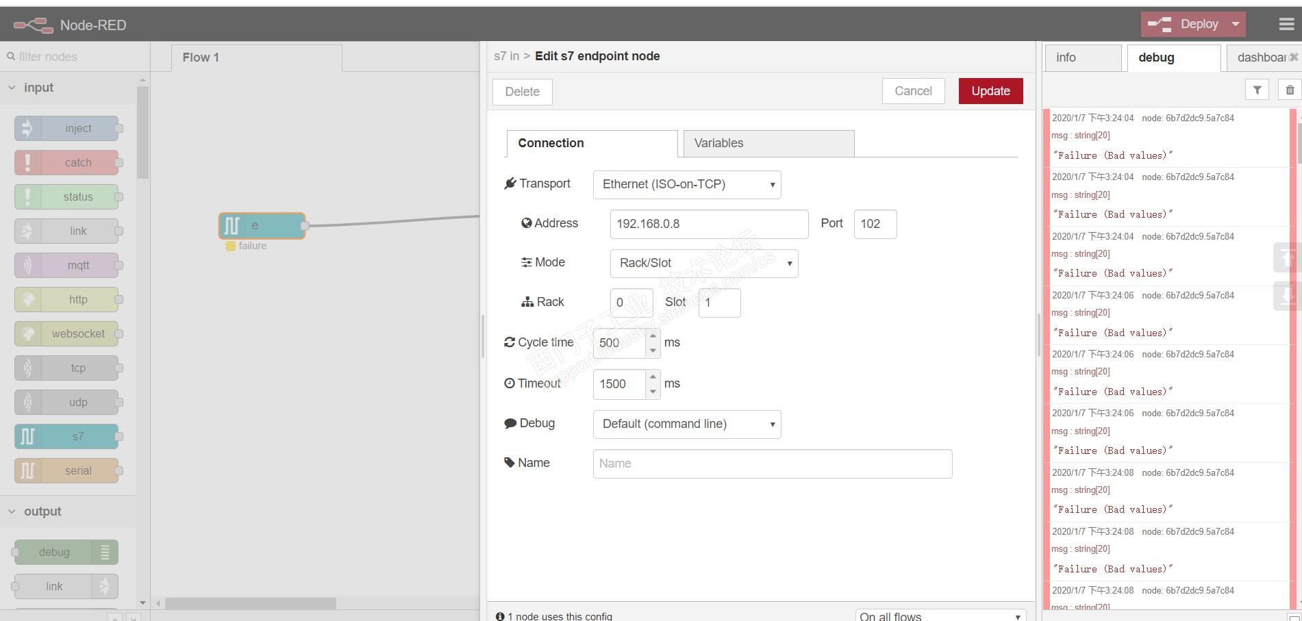 大家好 我搭建了一个demo,在node-red读取PLC-1200变量时一直显示Failure (Bad values)。