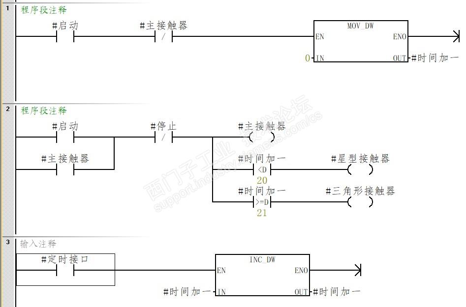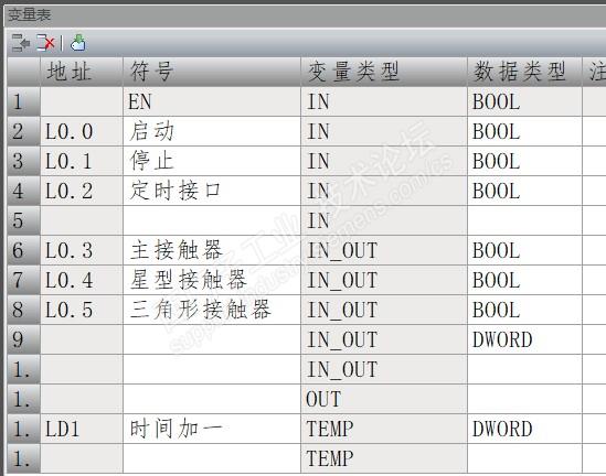 编写了一个简单的星三角启动的子程序,其中用于计量时钟的变量是“时间加一”变量,如果把”时间加一“这个变量定义成IN_OUT,子程序可以多次调用,但是定义成TEMP,就无法正常执行了,请各位好心老师帮我答疑。