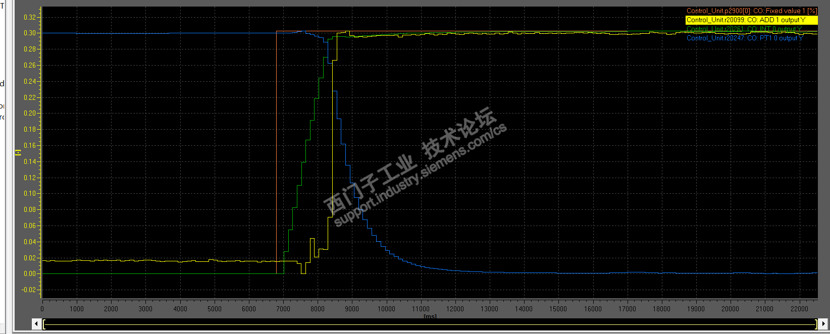 在30%的阶跃给定响应下,通过STARTER的TRACE,录波图形如下:
