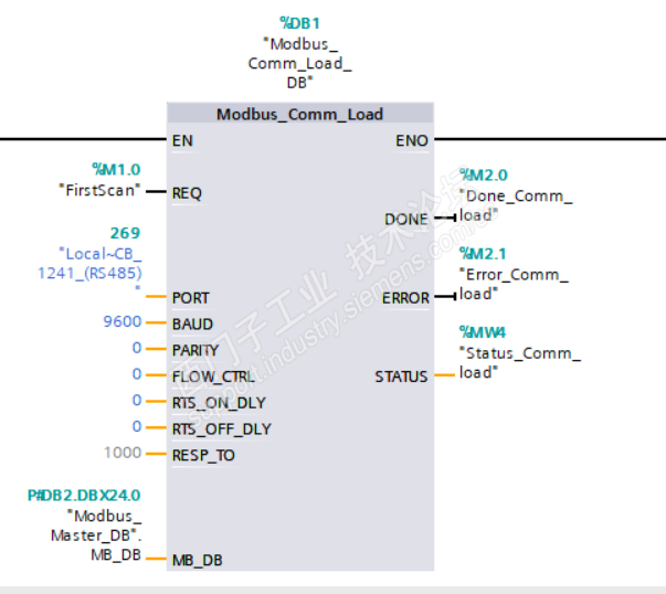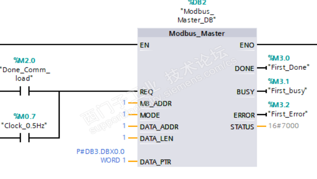 我想通过1200modbus通讯,PLC做主站发报文,报文为01 0F 00 00 00 01 01 01 EF 57,经过查阅帮助文件,我用Modbus——Comm_load和Modbus_Master指令,