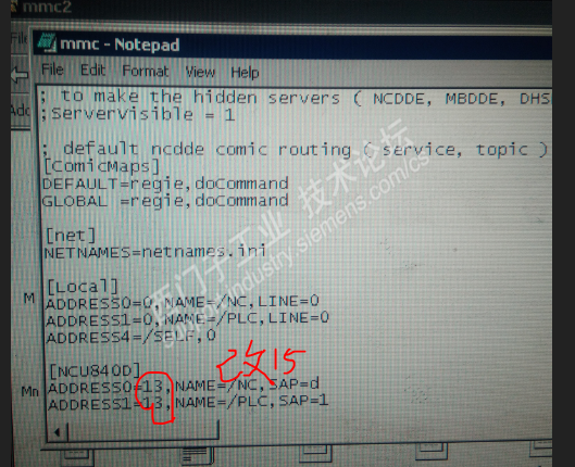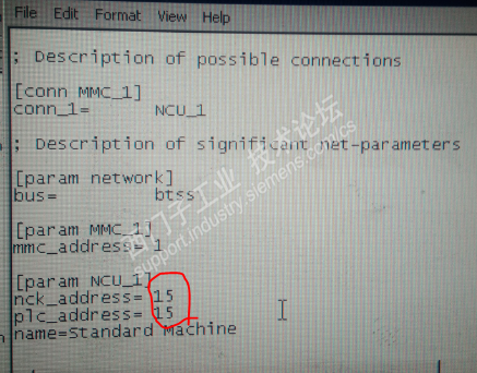 也就把13改为15试一下,可是没有想到,改完后,系统彻底完蛋了,通信无法链接,想进入MMC将NCK地址改回去,结果MMC的权限只有0级,无法输入口令,改不回去了,没有办法我将系统之前做的GHOST备份恢复过去,但是还是没有办法通信,之后我又总清PLC和NC,但是还是没有通信上,重送NC和PLC程序会出现200#报警。