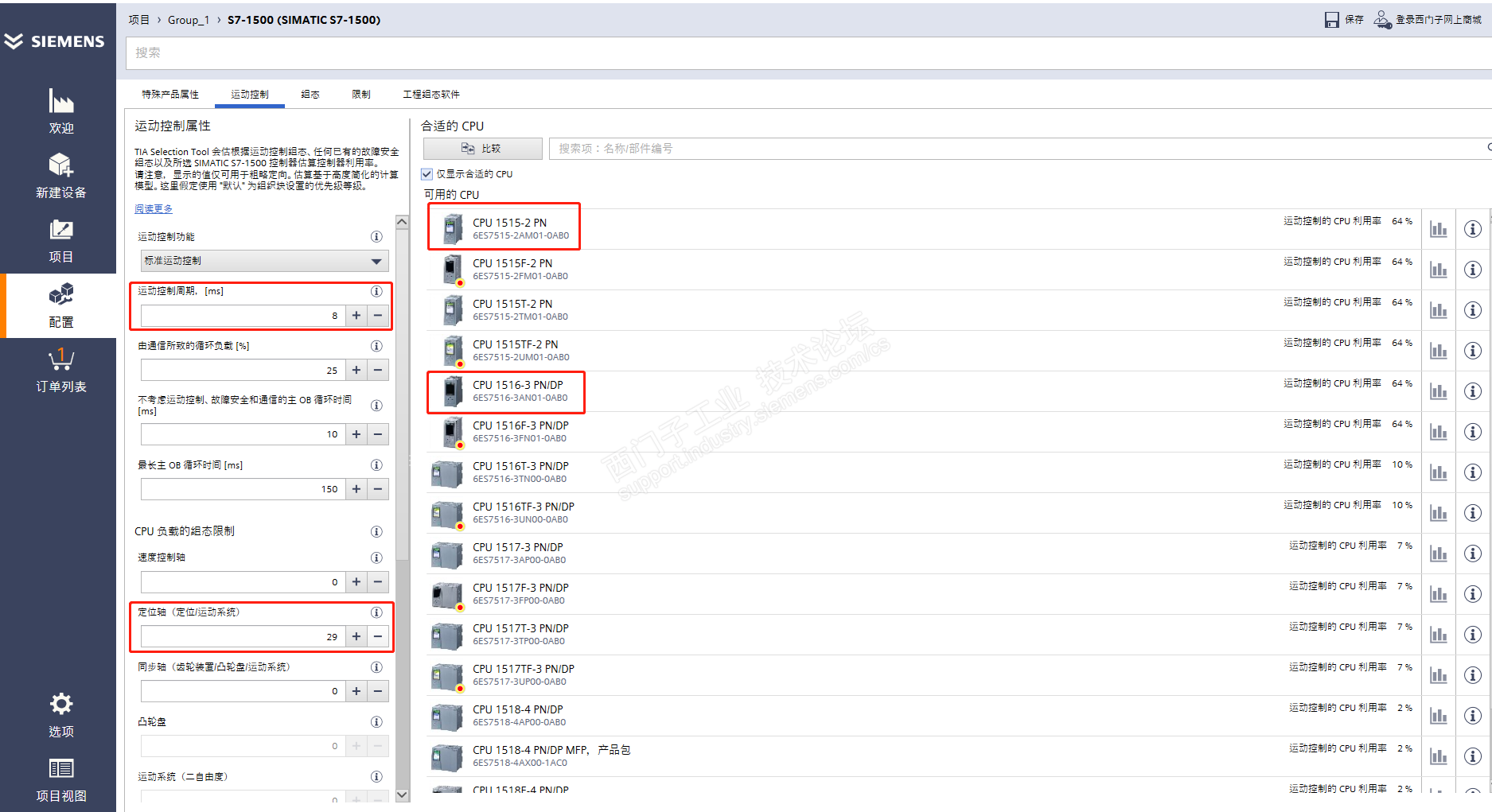 而我用Selection Tool进行运动控制的选型时,通讯循环为8ms时,可组态29根轴,