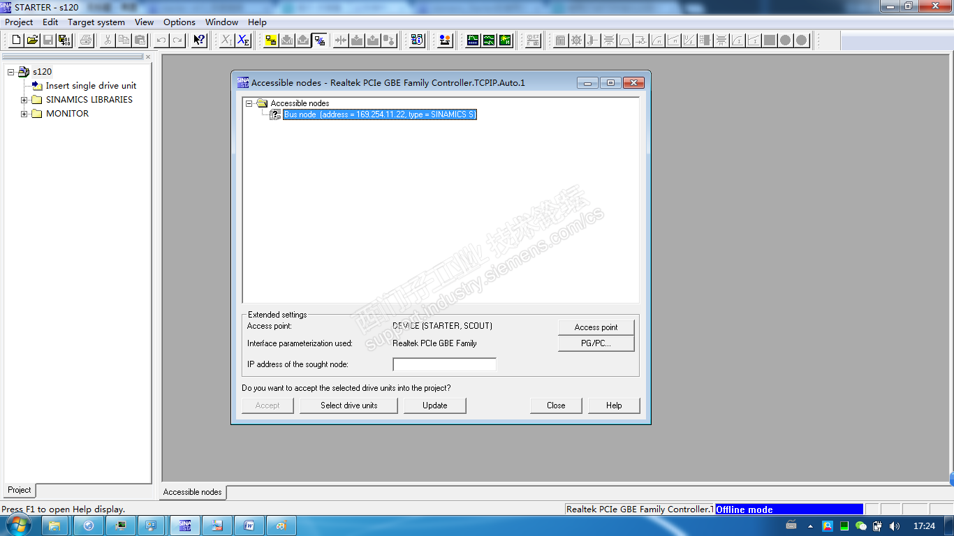 安装完成后,查找可访问节点,可以找到节点,但不能显示正确型号,节点前显示问号,且左下角的“Accept”按钮是灰色的。如图所示: