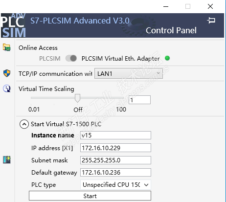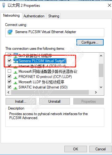 1、在B上全新安装Win10 1909专业版,关闭防火墙,安装PLCSIM Advanced 2.0 SP1(或3.0),安装完成后,查看网络适配器,除了本地连接(手动改名为LAN1,地址172.16.10.64)之外,还有一个虚拟网卡:Siemens PLCSIM Virtual Ethernet Adapter,地址默认是自动获取的,无意义。