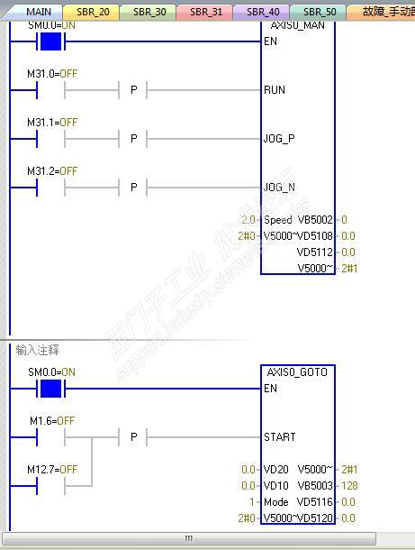 用200smart的向导做程序控制一汇川伺服电机做走位控制 ,不需找原点只走位 然后就写了ctrl goto man三段子程序 ,但是触发goto可以走位 但是只要man一触发就报128err,如下图。