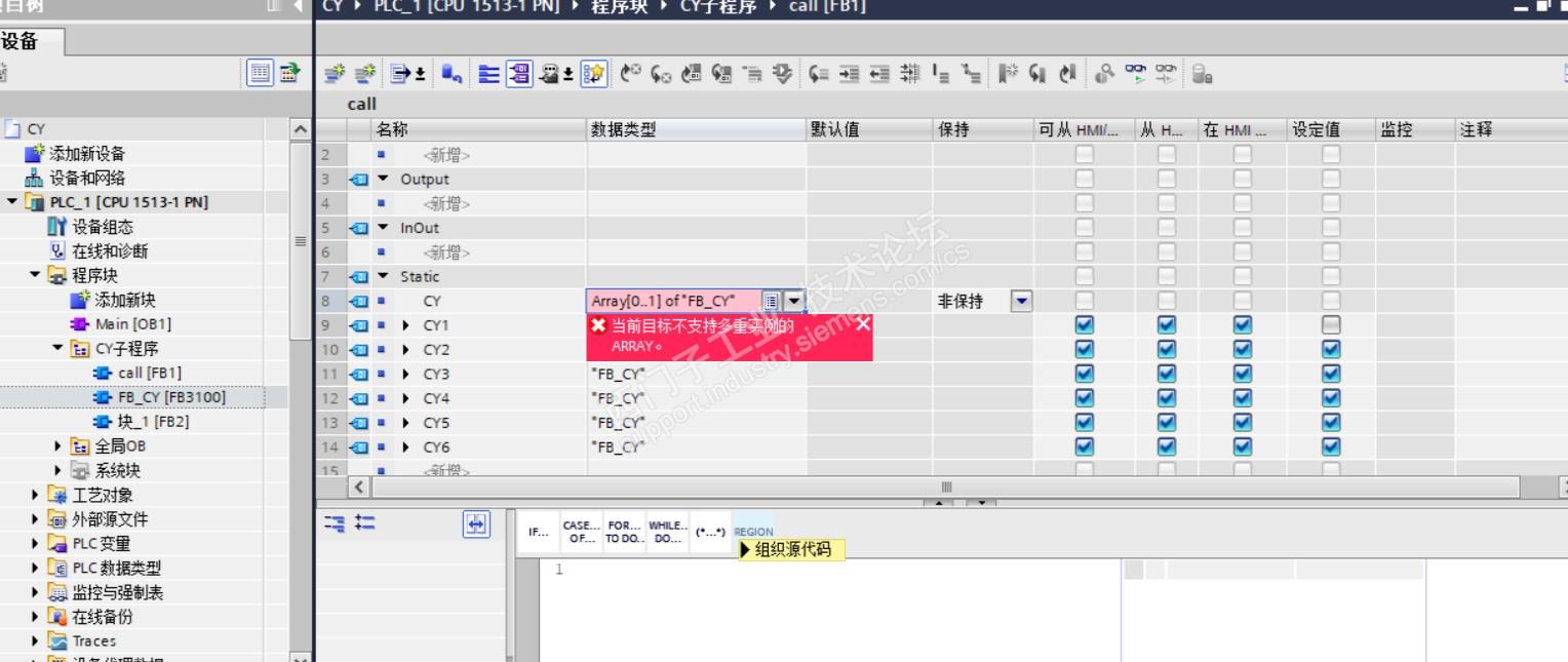 说明:编写一FB块(控制气缸的子程序),块名称为FB_CY,在另一FB块里调用,参数接口static中定义数组,数组类型为FB_CY报错。想用FOR语句赋值。请问下报错原因及解决方法。