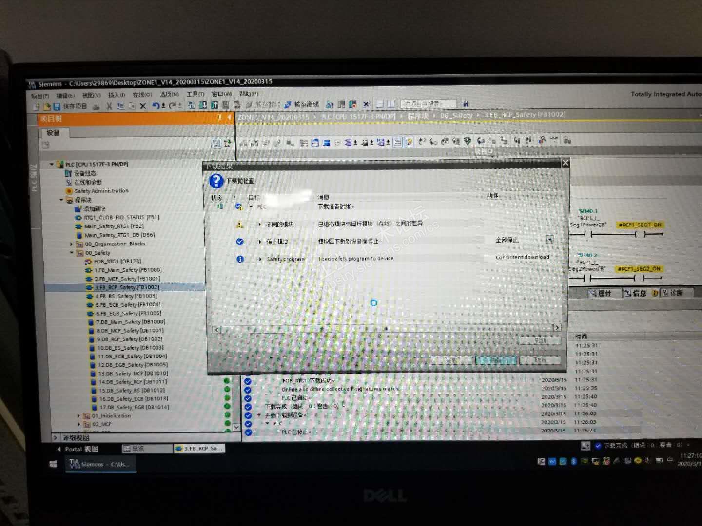 修改安全程序后,下载,博图卡在这个画面,PLC无法启动至RUN模式,一直为STOP模式,将博图关闭后,电脑与PLC无法连接,PLC断电重启后恢复连接,重新下载程序,PLC恢复正常。