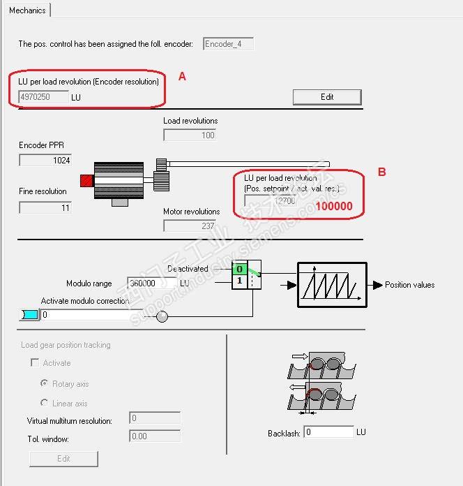 负载轮子的周长100mm,那么负载旋转一周的LU精确到1um的话就是100000LU,齿轮比为2.37