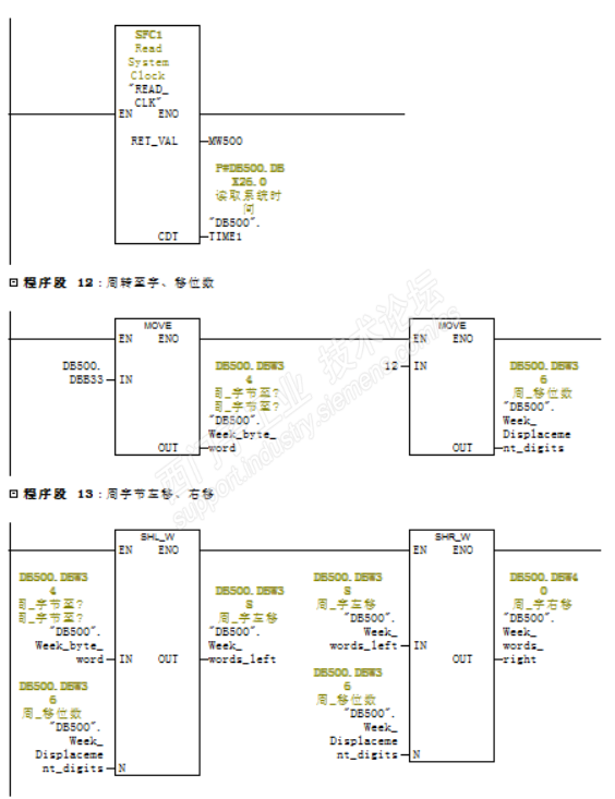 在DB里添加DATE_AND_TIME,按F1查看时间点地址,然后在FC块里插入FC1,因为实际需要周时间,所以读将该字节左移12位,然后右移12位,达到单独读取“星期”的目的。详见图例