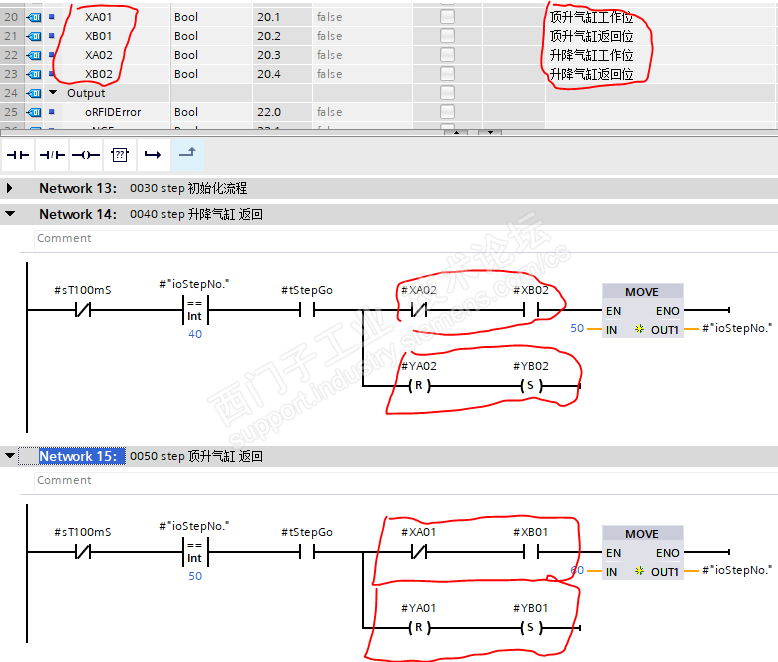 所以在这个FB块没有对输入输出进行操作(DB_Cylinder.1.AutoGoWork、DB_Cylinder.1.AutoGoHome)。而另外一个地方,例如标定位置也有一个FB块想刷这两个变量,也是输入输出接口。会导致标定的FB块无法将这两个输入输出变量Set或者Reset。我的印象中300的PLC是不可以,1500的LAD块有时候可以,有时候不行。可能跟FB块扫描顺序有关系。但是这种情况也不应该算双线圈输出;