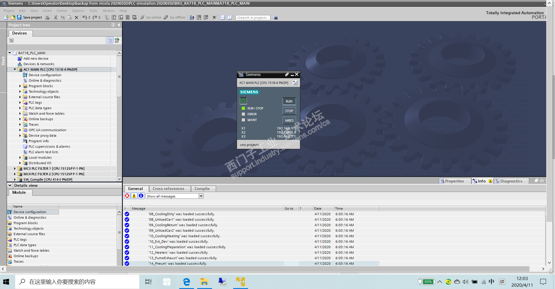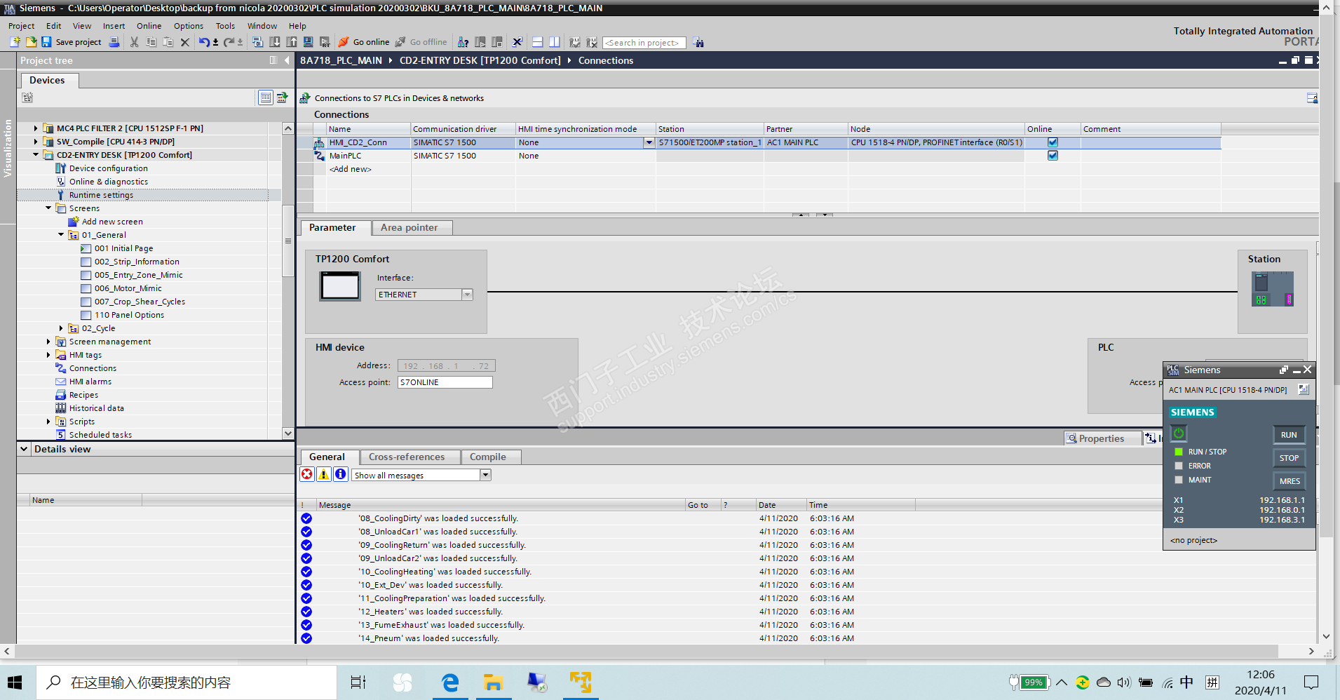 1. 启动plc仿真,注意选择 connection to interface/subnet 哪个地址,确定和触摸屏同一个网段。如图一。2. plc仿真运行启动。如图二。3. 在触摸屏通讯配置中设置参数。注意要和步骤一中下载的 slot同一个网段。如图三。4. 启动触摸屏仿真,通讯建立。如图四。