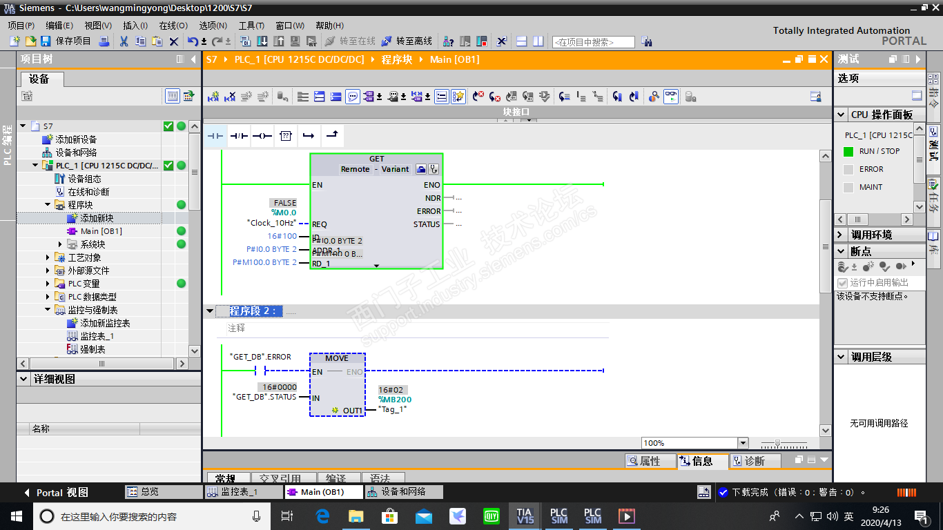 西施,这个地方一开始我把服务器测的允许put/get访问,没选,选成web服务器了。这个地方16#02.修改过来了,从主机上测试读写都正常了,可是还是包16#02.产看帮助没大看明白。都已经准备发帖子询问了。又把原来的程序,又重新下进去。16#00了,正常了。这个status 一直保持最初的错误值16#02,中间修改正常了也是16#02吗?status不应该是每次M0.0执行PUT时候的值吗?看到的情况是这样,请西施指点。