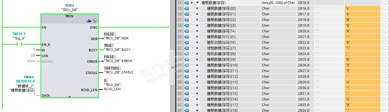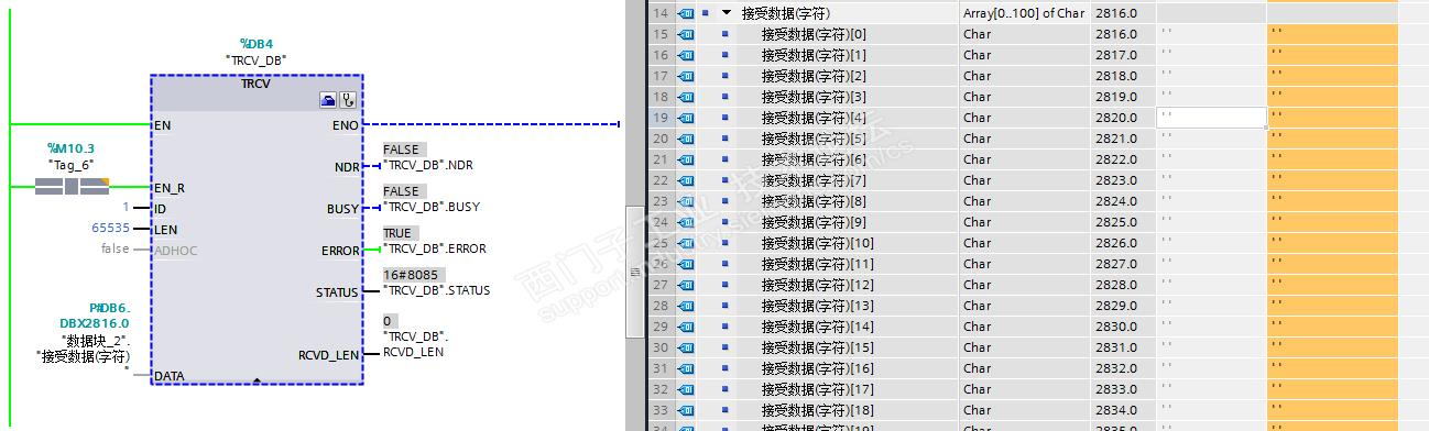 小弟遇到一个1200PLC与视觉相机走TCP通讯的项目,现在是视觉相机发出的字符内容已经确认是对的,但是视觉相机发的字符数量不是固定的,是浮动的,我在视屏学习中心看到说 "TRCV_DB"的“LEN”是可以设置为65535 ,这样"TRCV_DB"块接受的字符数量是可以变得。我设置好了后 "TRCV_DB"块的STATUS报“16#8085”错误, 接受的数据也是空的 ,劳烦哪位大哥指点下,怎么能把数据完整接受过来 ,小弟在此谢谢了。
