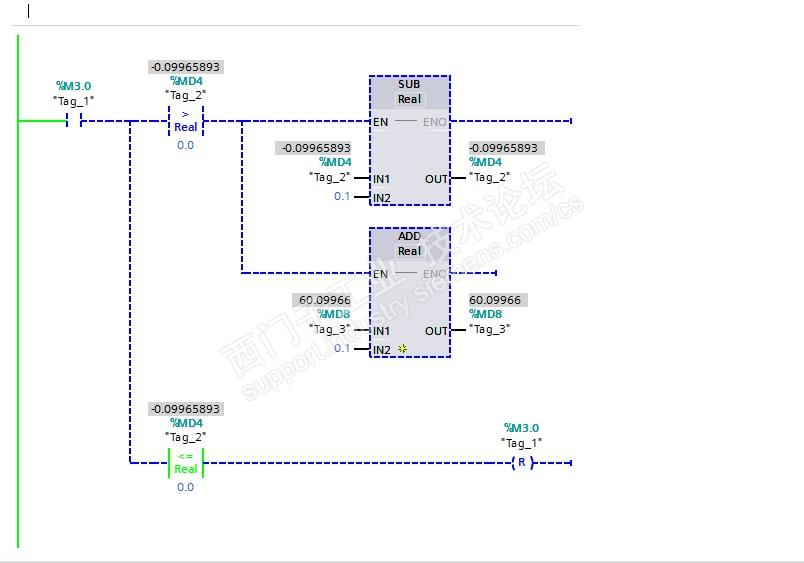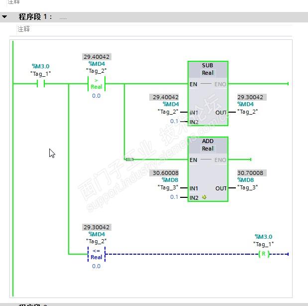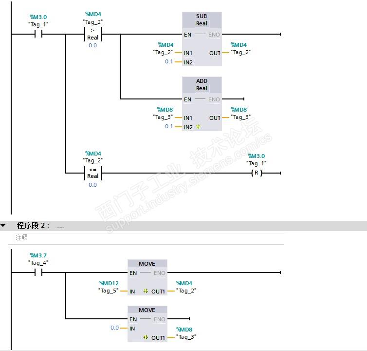 西门子1200PLC,新建个OB35写了个小程序,感觉结果和预期的不一样。现在用仿真看了下。结果不是预期那样。为什么会出现后面的小数啊?望高手给解决下程序就一个OB35,写了下面两段程序。
