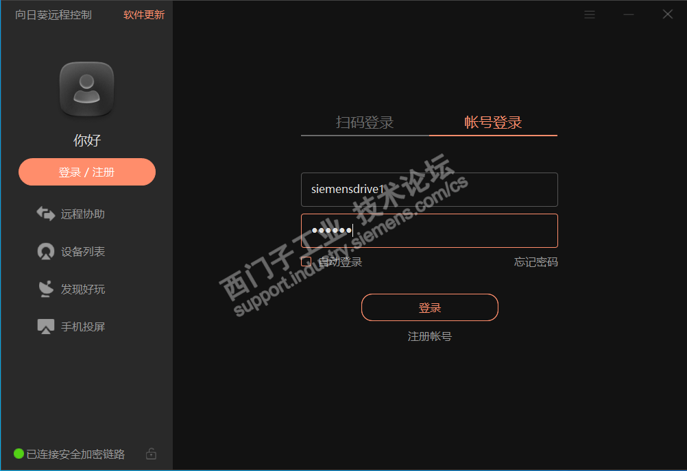 当安装好向日葵软件客户端后,打开会弹出如下画面,使用账号密码登录。
