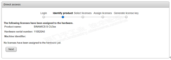 4,如果已经为该存储卡分配过授权,则会在以下界面中进行显示,不需要再重复分配,若未曾分配,则显示还未对该硬件分配授权(No licenses have been assigned to the hardware yet),此时点击“Next”。