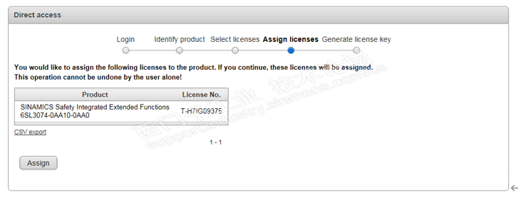 6,在下方界面中可以对已选择分配的授权进行总览,确认无误后,点击“Assign”按钮将授权永久性的分配给当前的存储卡。如果需要,可以点击“CSV export”将产品描述和授权证书号导出并保存到本地。
