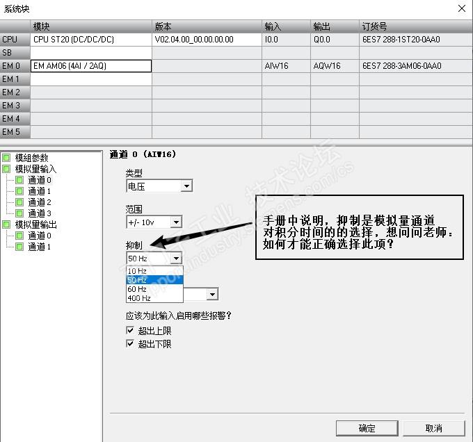 在200smart系统手册中,模拟量通道的“抑制”是对该通道的积分时间的选择,我想问问各位老师,如何能正确的选择这个抑制选项,谢谢各位朋友的帮助!