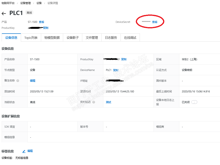 注意红圈中的内容,这是认证设备要用到的信息,阿里叫他 三元组,信息需要保密,特别是其中的 DeviceSecret,不能外泄,否则别人可以冒充你的设备联网了。